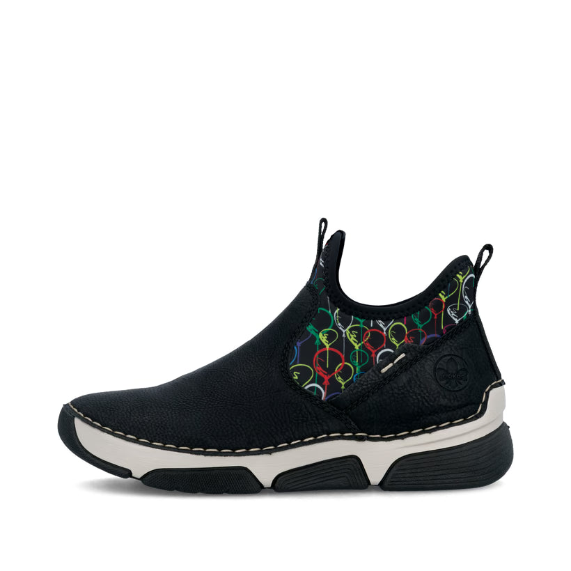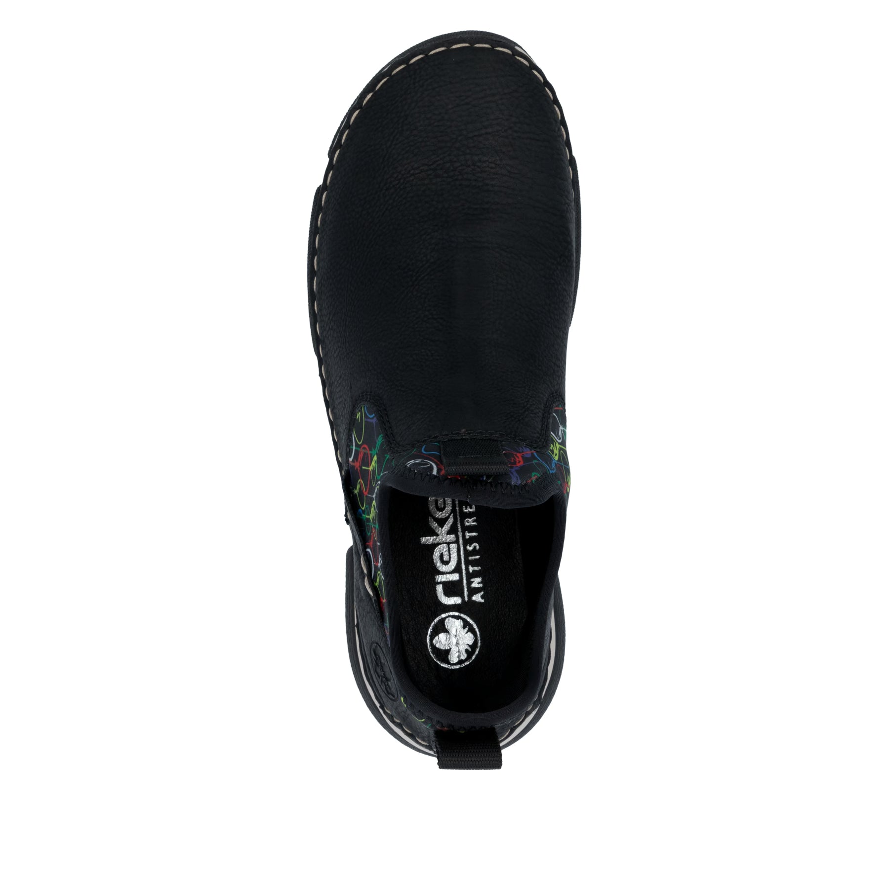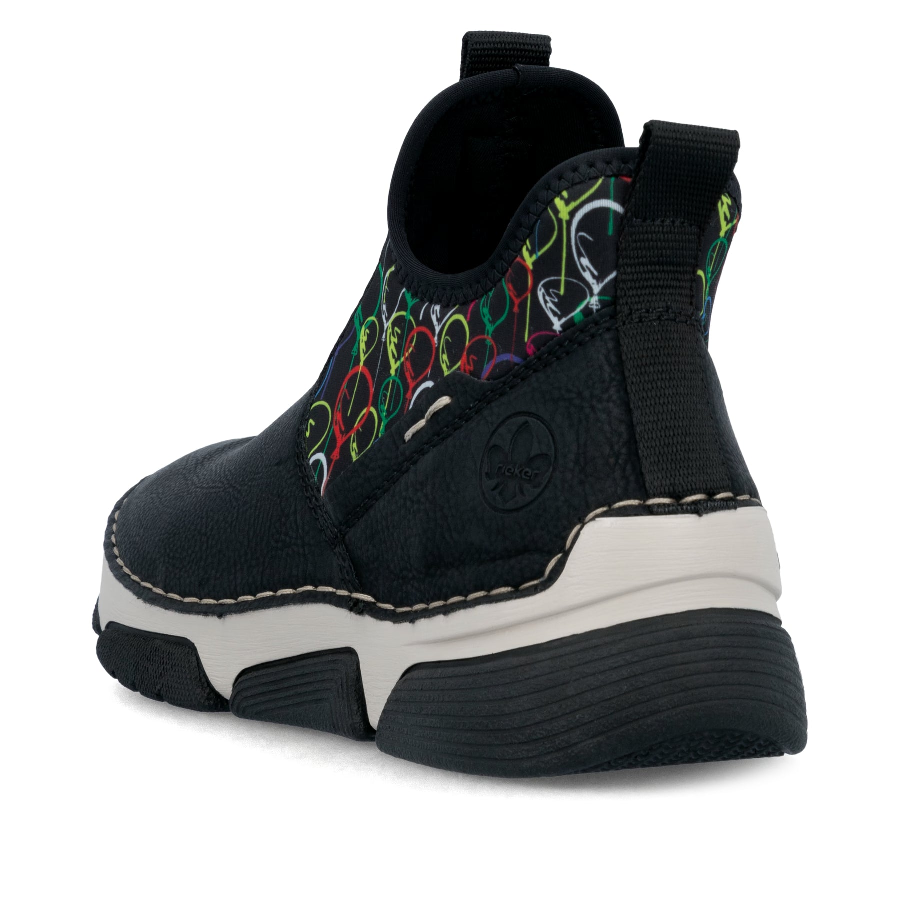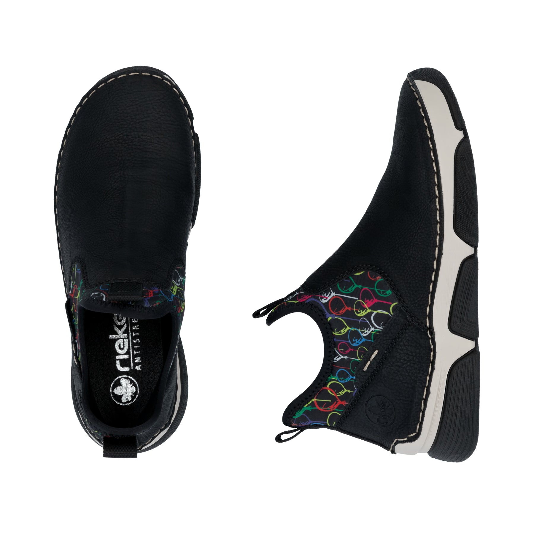 Rieker ladies short boots 45957-00 black Komfort und gutes Aussehen - das geht! Diese schwarzen Rieker Kurzstiefel überzeugen mit echtem Komfort für die Füße. In der Anflechter-Machart gefertigt, ist das Modell robust, flexibel und bietet eine perfekte Passform. Es muss kein Verschluss betätigt werden, denn durch den elastischen Schaftrand lässt sich der Schuh schnell und unkompliziert anziehen. Die schockabsorbierende und leichte Sohle bietet besten Laufkomfort und die extra weiche Decksohle ist ein weiteres Plus. Da steht langen Spaziergängen nichts mehr im Weg!